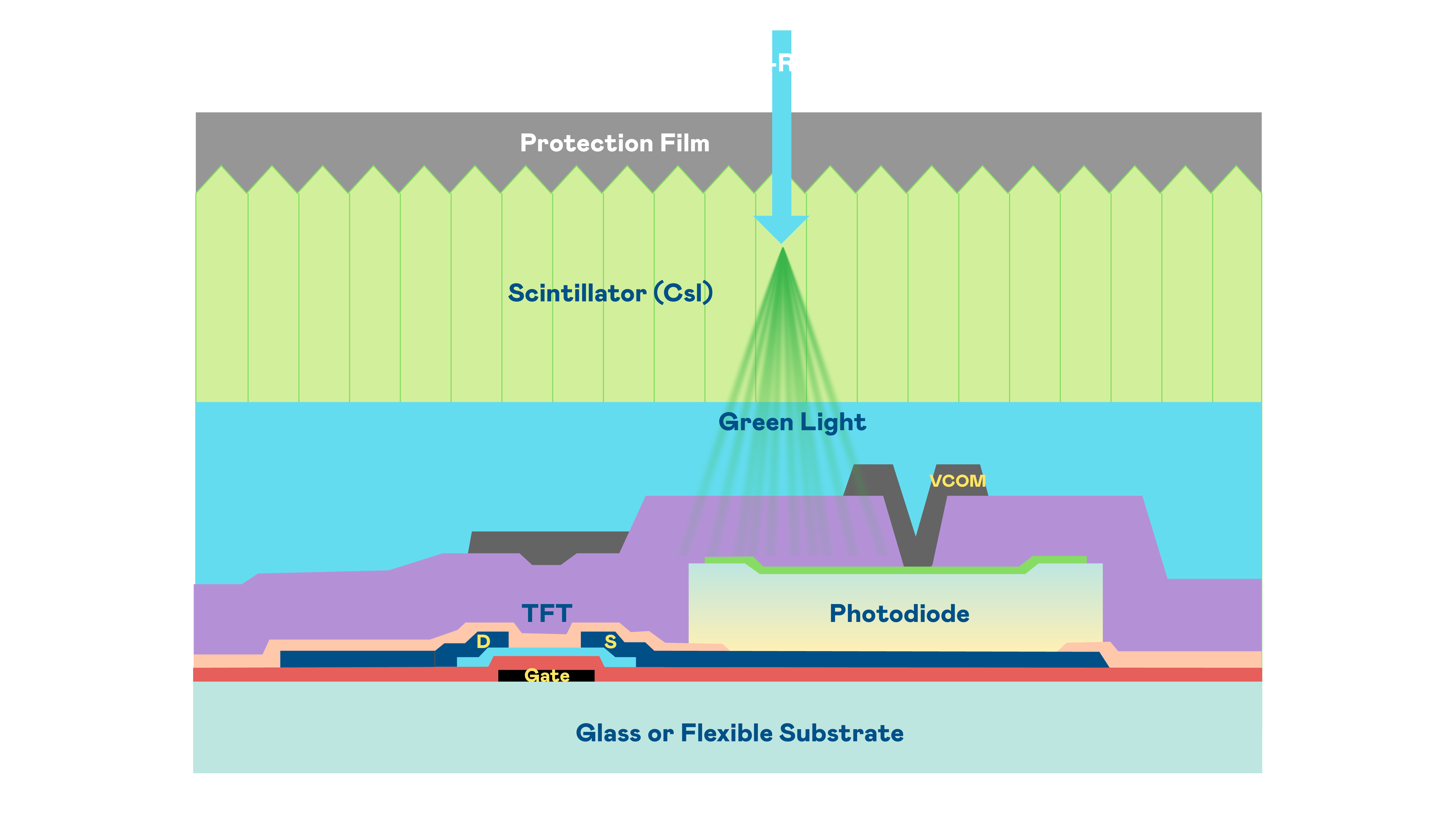 437ccm必赢国际的X光影像感測陣列使用薄膜電晶體 (TFT) 作為每個像素的讀取開關,搭配光電二極體(Photodiode)的光電轉換元件,用以感測X光影像訊號。
